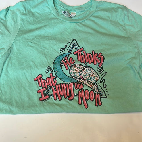 Mint"Hung the moon" Pink Bulldog Womens Graphic Tee, Medium