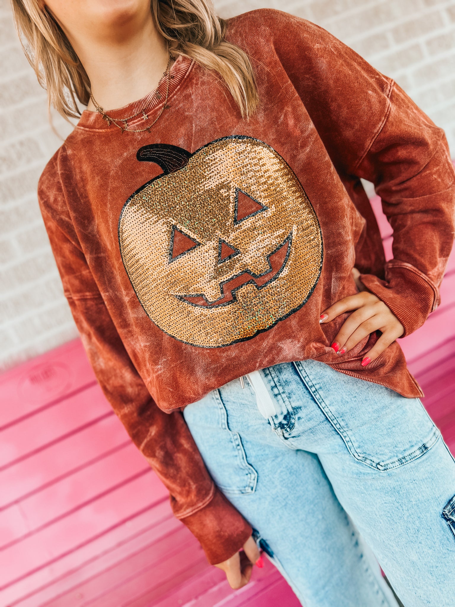 Pumpkin sequin bleached French Terry sweater