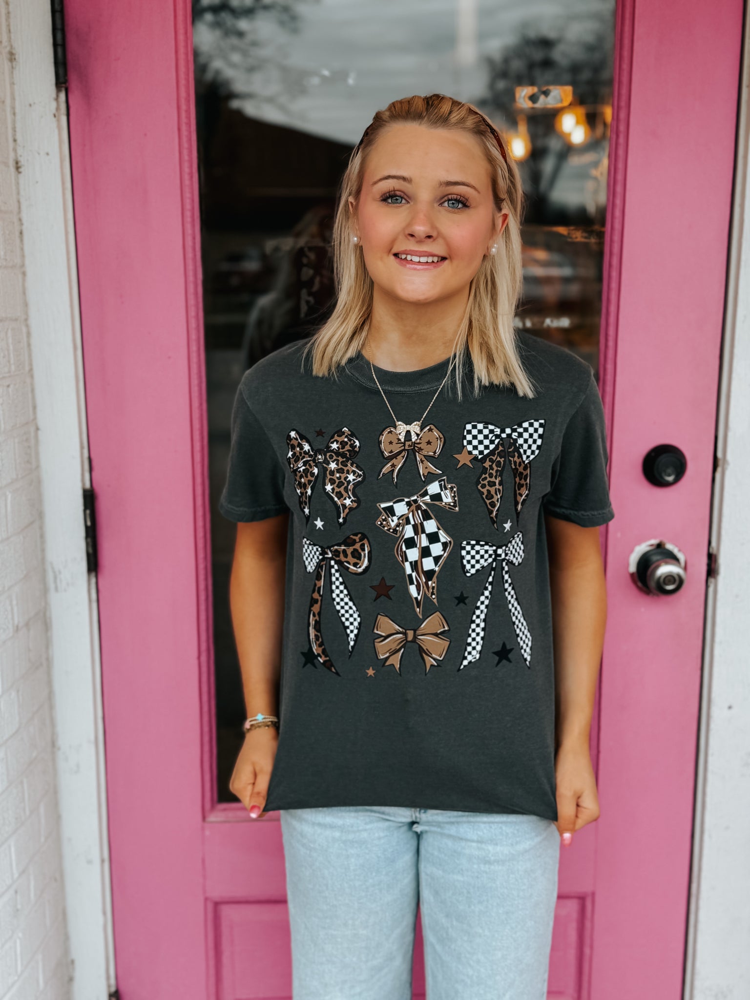 • Load image into Gallery viewer, Leopard check bow grid tee