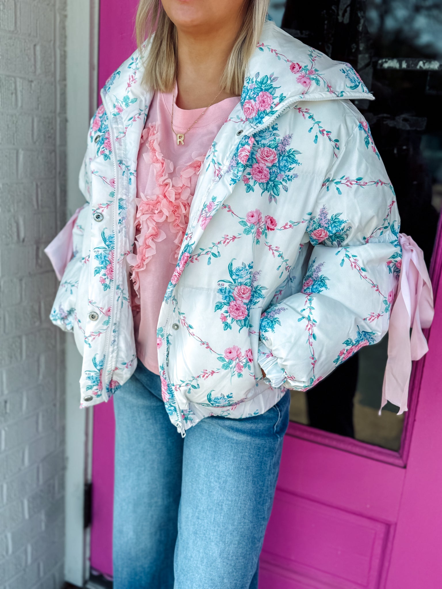 Floral Print Bow Knot Elbow String Puffer Jacket