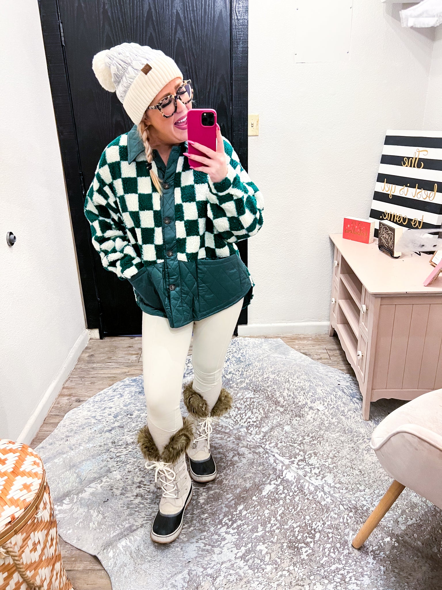 The cutest Quilted Sherpa shacket! Roomy oversized fit! Size down for a more true to size fit!