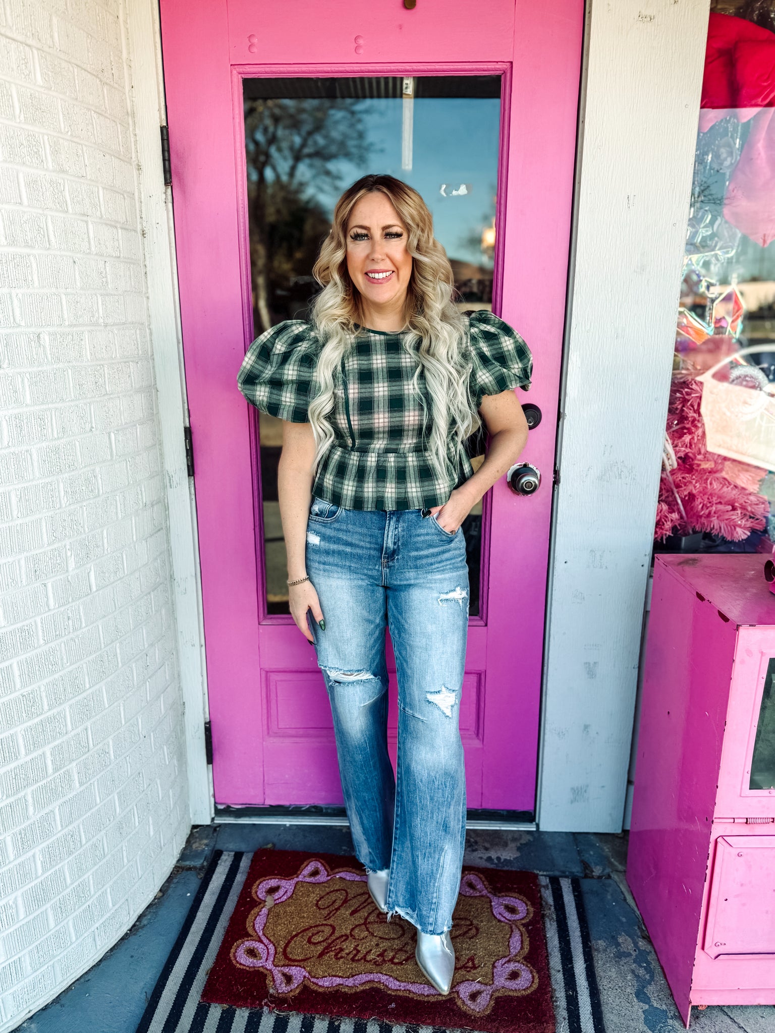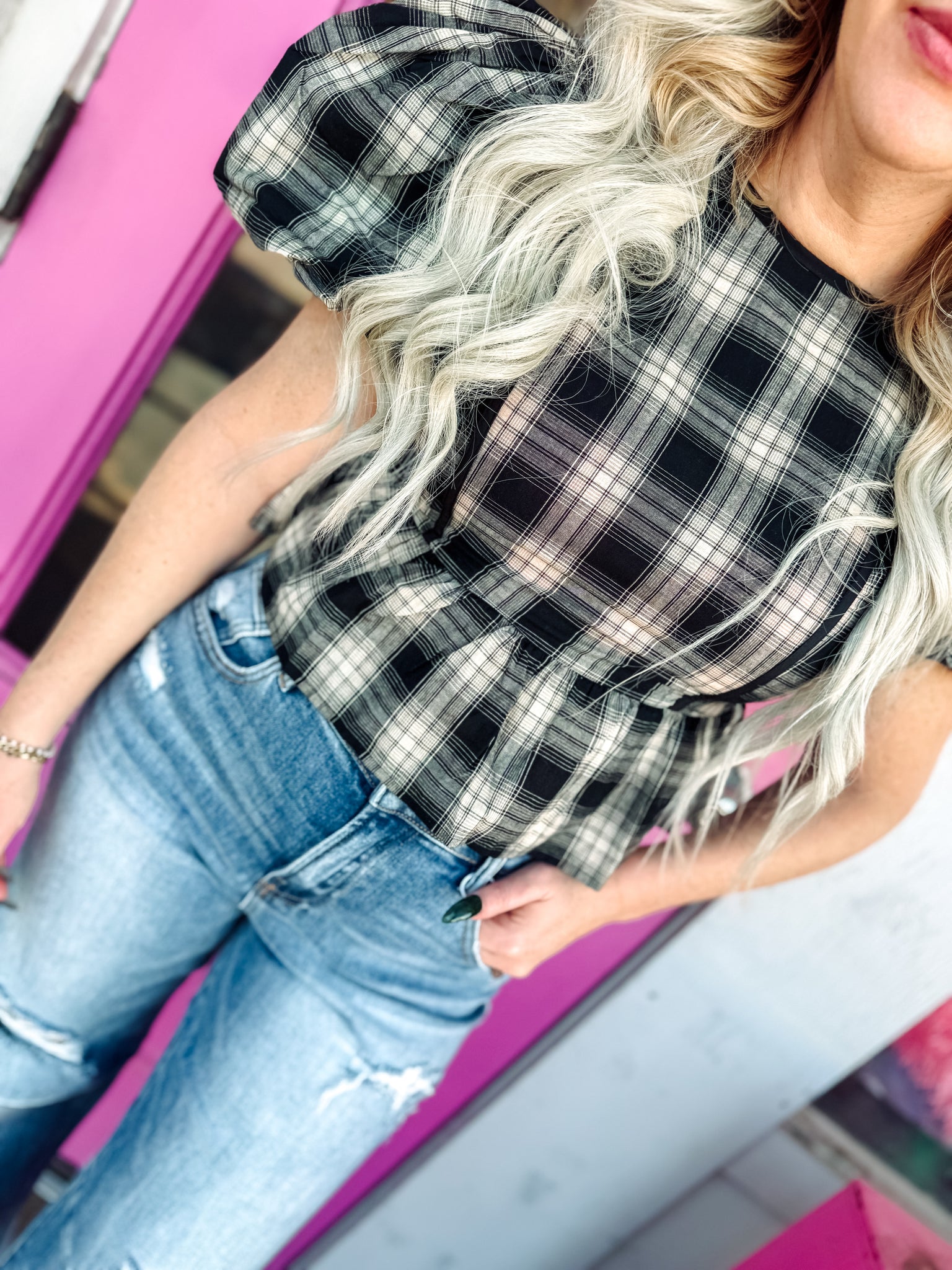 Plaid Bubble Sleeve Peplum Blouse