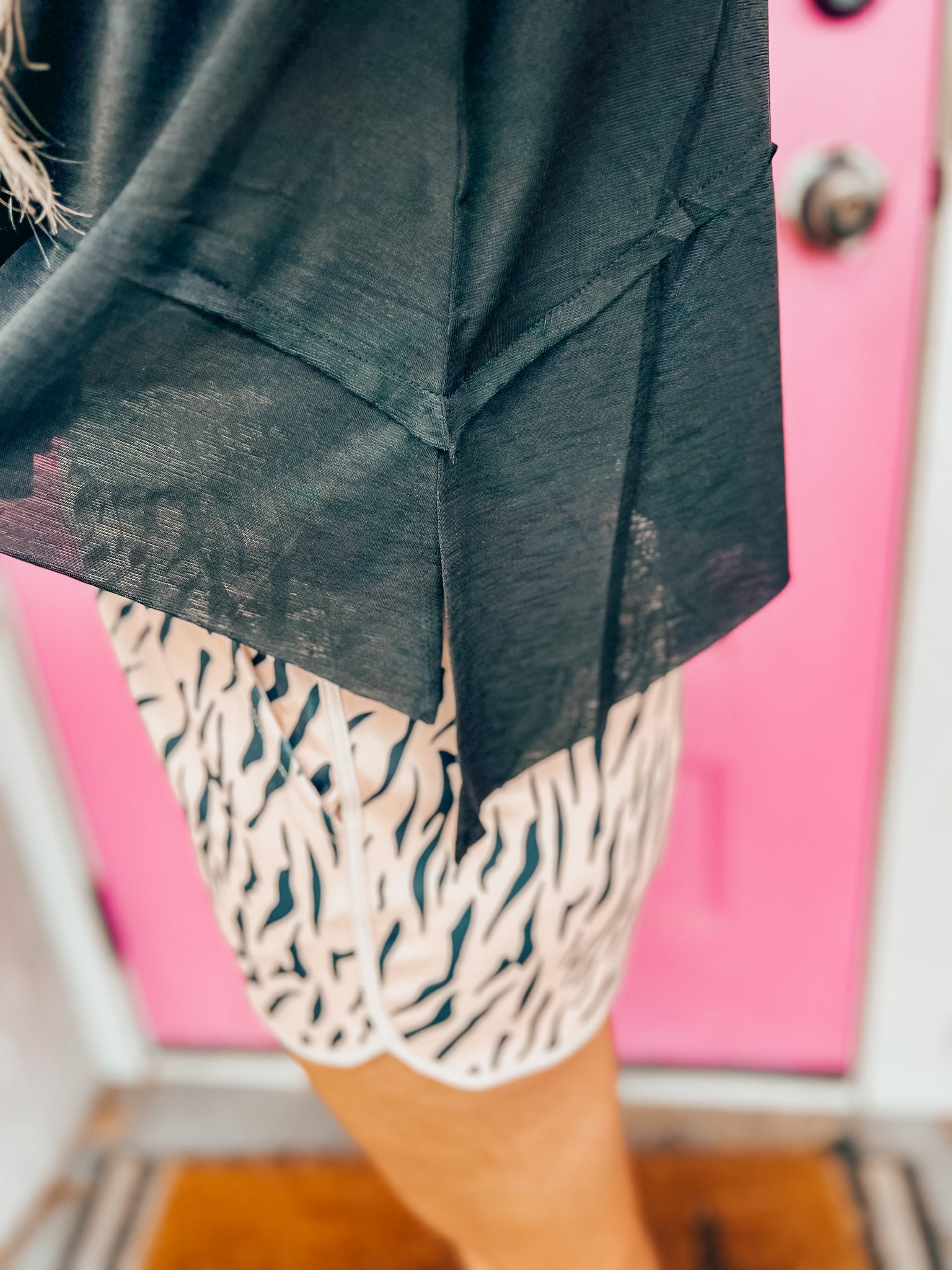 A soft stretchy dressy material! Perfect to dress up or down! Model is a size 6 wearing a medium fits true to size