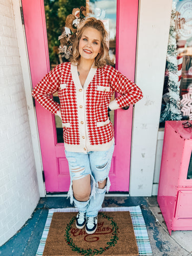 Red Houndstooth button up cardigan